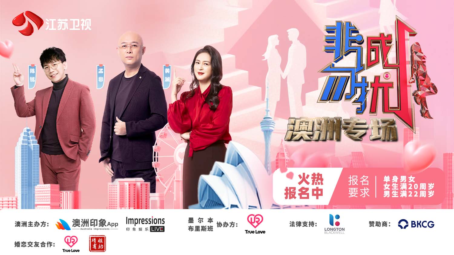 《非诚勿扰》是江苏卫视制作的一档具有广泛影响力的相亲交友类电视节目,自 2010 年 1 月 15 日在江苏卫视首播以来,长期占据话题热度,成为中国婚恋交友节目领域的标志性 IP。多年来已成功助力无数单身人士觅得真爱。自 2011 年开启海外专场征程,澳大利亚作为首个落地站点,便引发热烈反响,如今,《非诚勿扰》再度重磅回归澳洲,携手澳洲印象共同开启澳洲站的精彩篇章。